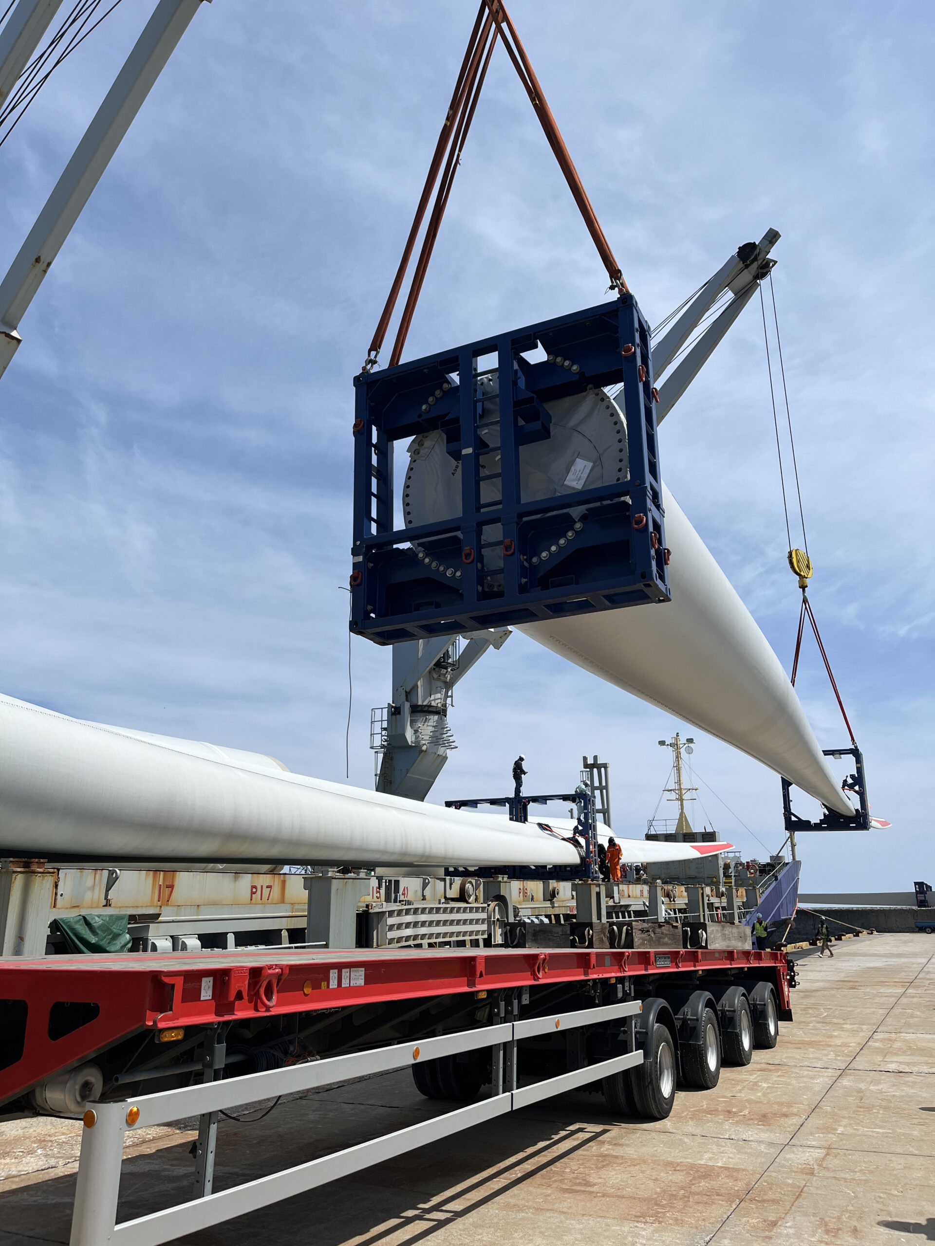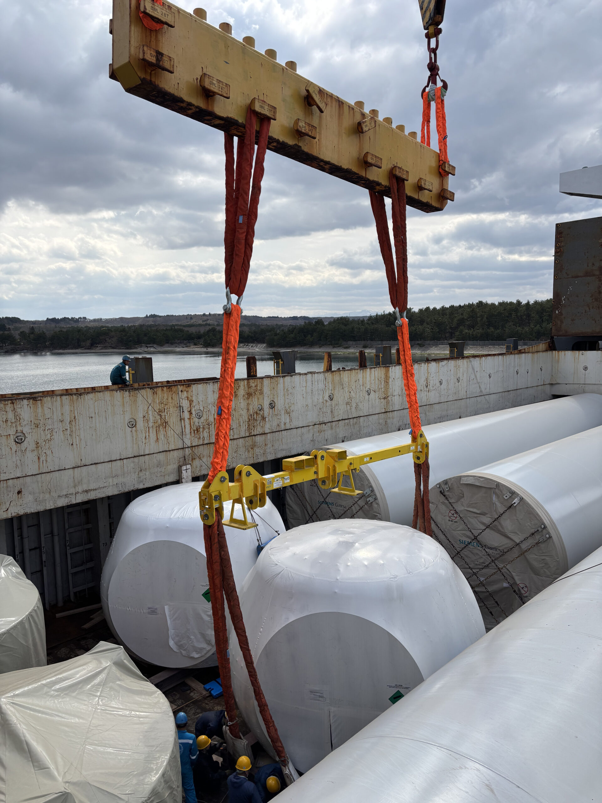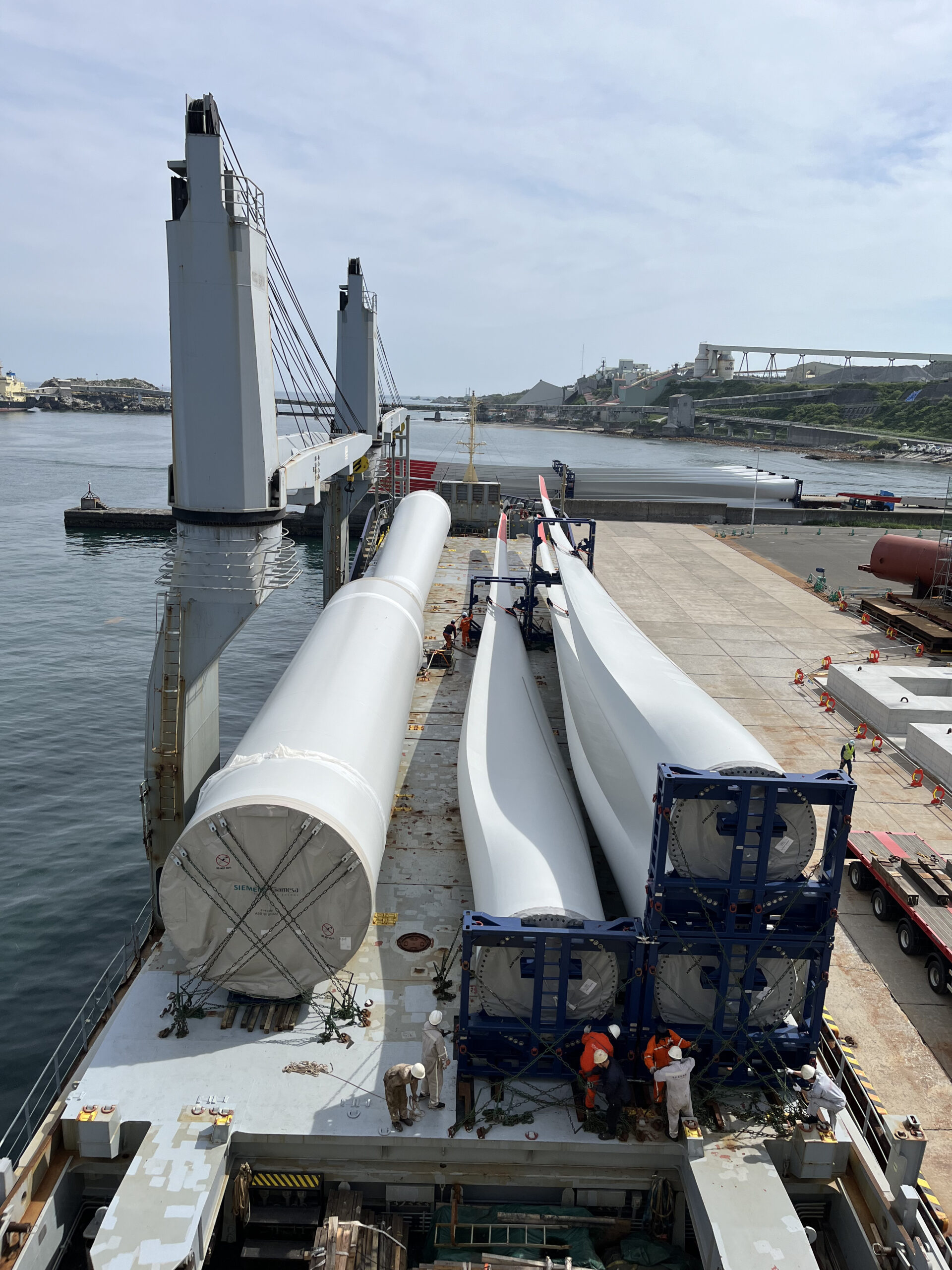中国で製造された風力発電設備(ブレード、ナセル、タワーなど)を、13,000トン級の貨物船で青森港へ海上輸送しました。現地では本船クレーンを用いて、水切による荷揚げ作業を実施しました。