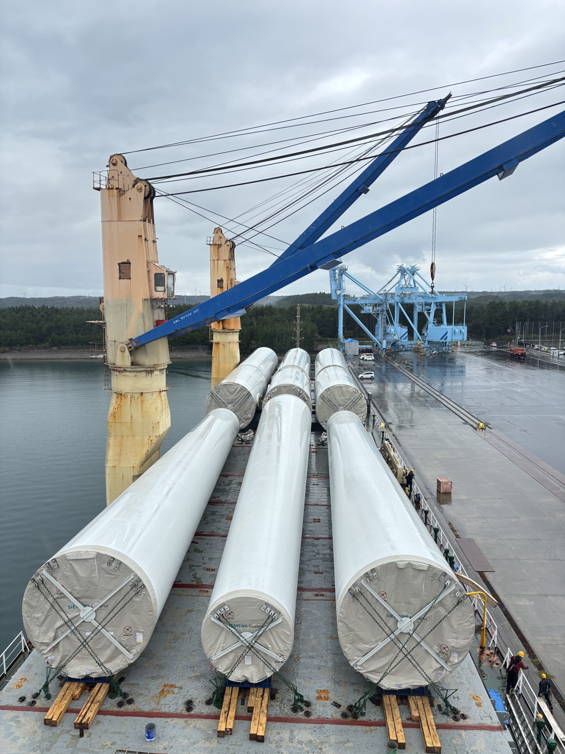 海外メーカー製風力発電設備(ブレード・ナセル・タワー)を、大型貨物船で青森県へ輸送。Liner terms H/H条件で本船クレーンによる水切り荷揚げを実施。他府県でも風車案件を多数取扱実績があります。